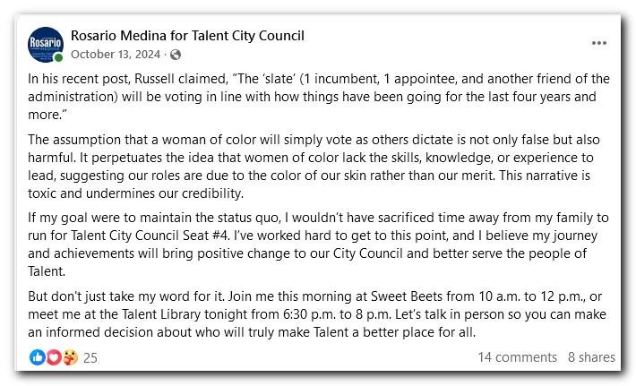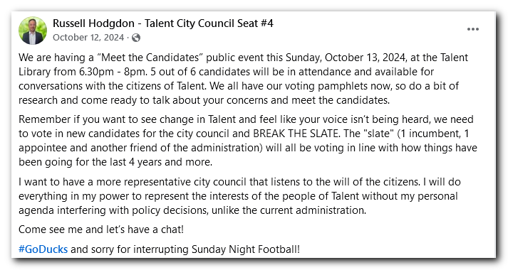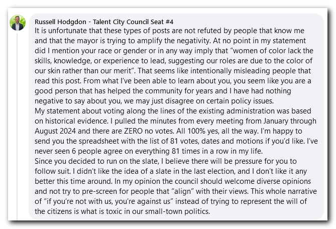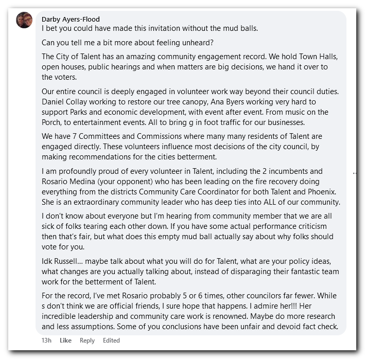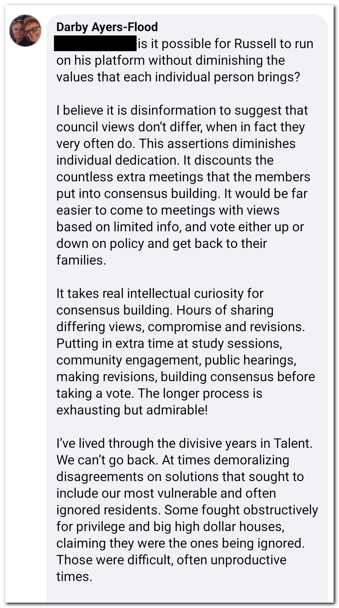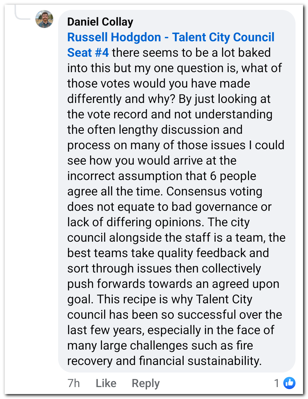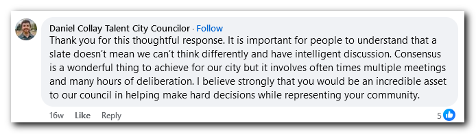Thanks for writing this! Maybe we need to look at boroughs so that each councilor represents actual individuals so that they are beholden to the wishes of a specific geographic area and are held accountable by those residents. Our current system really limits personal accountability for residents to hold individual council people to task for their votes. It just ends up feeling like they are all one team with a specific agenda and no real local accountability or opposing opinions being voiced. The same thing happened to me when I applied for the open seat that Daniel Collay was appointed to last summer before the election. I had written thoughtful answers to their list of questions, and no one asked me any questions about my answers and just voted unanimously for Daniel as though the decision had been made before I got there. It is pretty frustrating trying to volunteer for local city government if you are seen as someone outside the existing bubble of influence. Especially as a Talent resident for nearly 40 years.