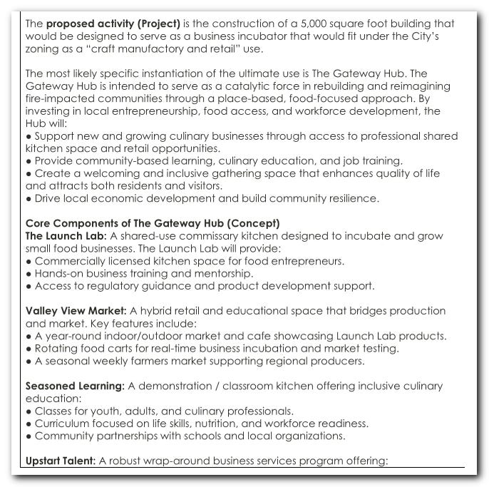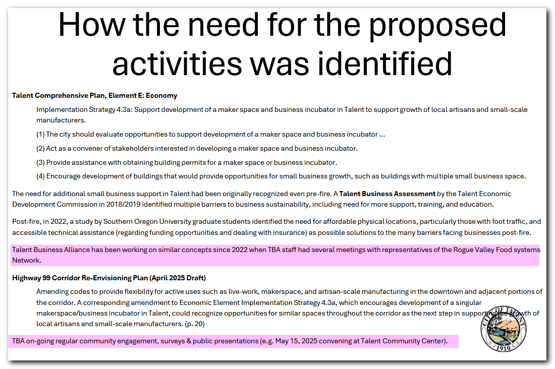 On July 2, 2025 Campbell sent a letter to PIER to start the process of requesting changes, then presented his proposal to the PIER Committee on July 31, 2025. The Proposed Activity he presented in that meeting was word-for-word TBA’s proposal for their Gateway Hub food-centric business incubator. The materials he presented included TBA’s claim that the need for a business incubator in Talent was identified through its own “ongoing community engagement, surveys, and public presentations.”
