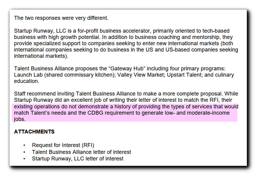 Here’s a question I want to end this with: If a local nonprofit applicant with the same track record and experience level was being led by anyone other than the Mayor of Talent, do you think it would be a strong candidate for the Lead Operator role of a food business incubator? And if not, is that a problem?