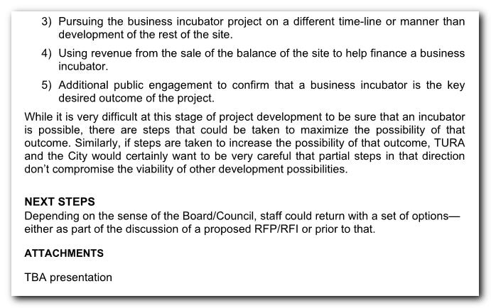 To summarize: City Manager Campbell convinced Council/TURA that re-routing 1.25 million from the road extension to TBA’s Hub was a solid plan and would help TBA be able to get enough funding for its full construction, then he went to PIER for approval to do that. He used TBA’s presentation content as the concept that would be implemented and he cited unspecified work that TBA claimed was how they know that a food business incubator is what the people want.