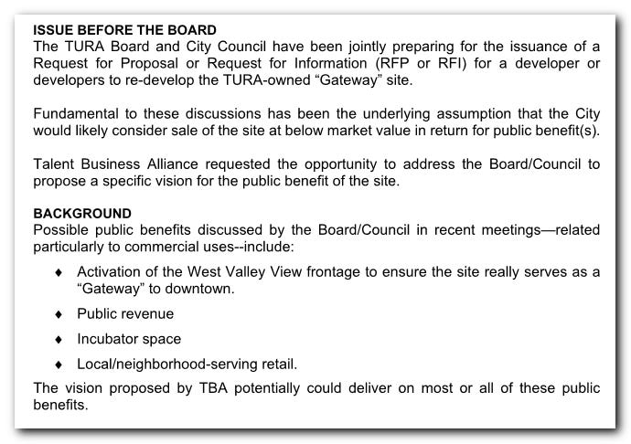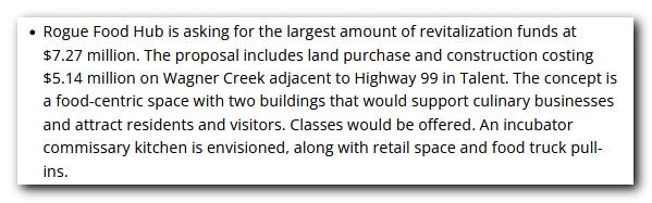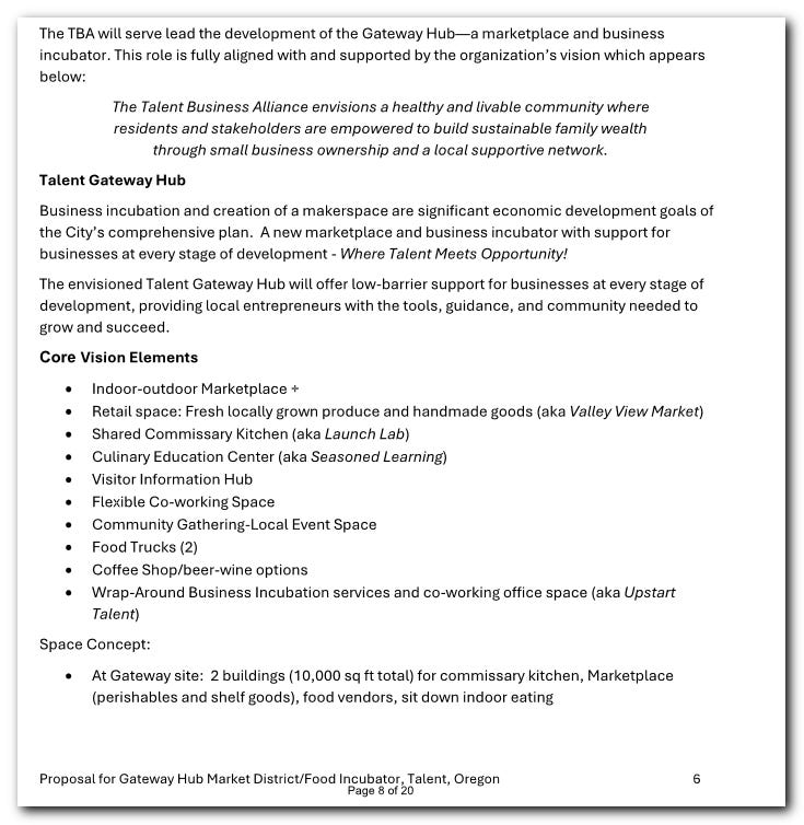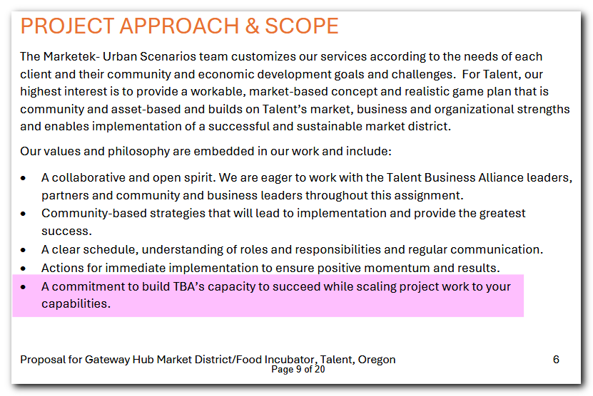 But the pitch to Council/TURA went beyond simply meeting a requirement. The structure TBA was encouraging them to adopt would let the City, even at that early stage, frame Talent’s need in a way that guaranteed TBA’s incubator would appear to be the perfect and perhaps only solution. The message was: It’s not just any community-serving public benefit feature, it’s a food-centric business incubator! Exactly what the people of Talent have been begging for all these years!