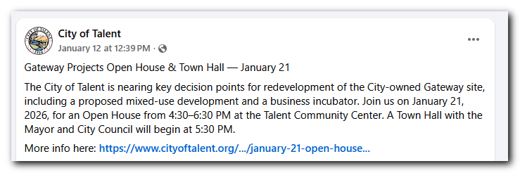 Prior to scheduling the Gateway Open House, City staff followed the Nov 5, 2025 meeting up with publishing a timeline in Talent News & Review without any context and probably confusing the hell out of people who haven’t been keeping up with the meetings.