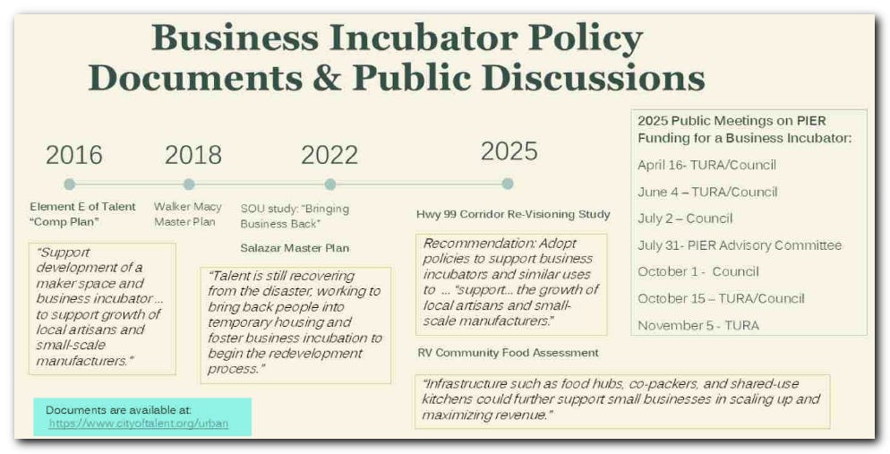 And also? Citing six and eight-year-old report language casually referencing incubators does not remotely establish what Talent residents feel like Talent needs in 2026. Things have changed. A lot. They know this.