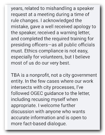 When they narrow “transparency” down to a checklist of meetings and documents, they’re trying to create an appearance of accountability without engaging the significant ethical concerns raised by TBA’s direct participation in City decisions.