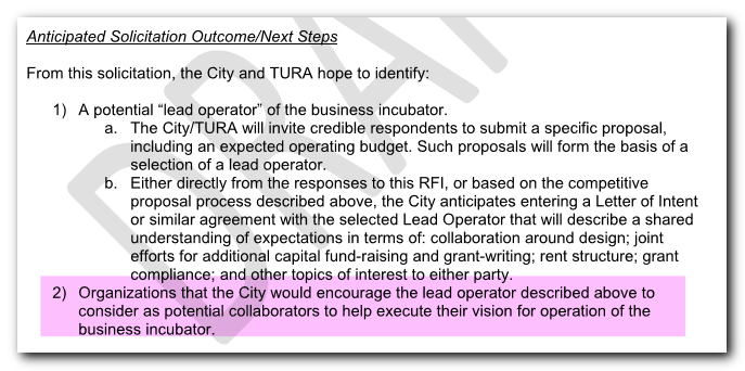 One of the items in the request for information was to “explain the selection process for the non-profit partner.” Depending on the legal structure of the business incubator, it is very possible that the city could simply select a partner organization as this is not technically a procurement. However, using a public process similar to a procurement, to invite interested organizations to apply to take on that role, could be a good step to assuage current and possible future concerns from the public or regulators.