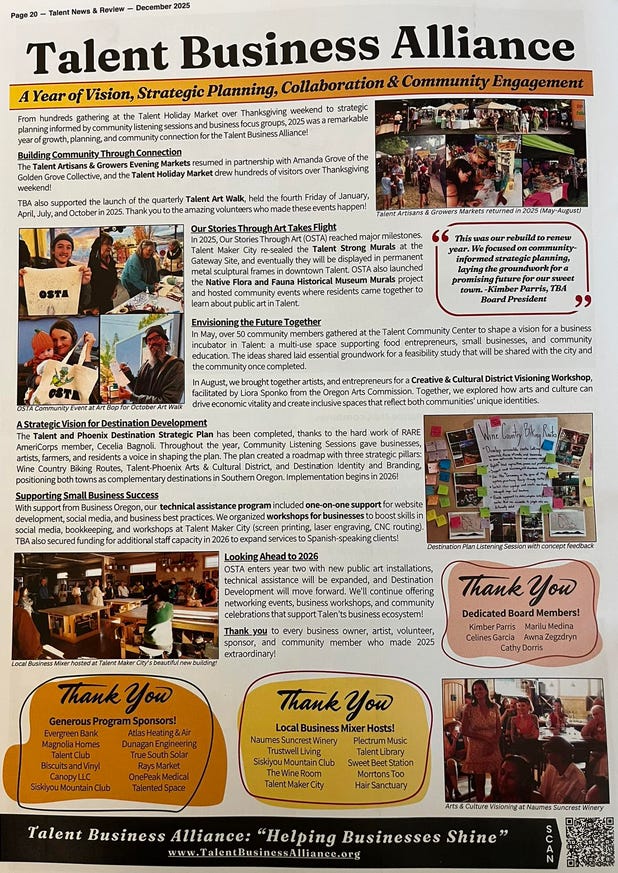 Sorry to end on such a bummer note, but I fear that none of these problems are likely to resolve themselves. The OGEC isn’t touching this stuff. These things are built into how Talent is currently governed and who holds power at the moment. If the people of Talent want a clearer separation between public authority and private interests, the only durable way to achieve that is through the ballot envelope. Structural change will not come from complaints alone. It comes from choosing different leadership. The next real opportunity to do that is the November 2026 election. Will the Mayor run again, or will she lean into her new career as an incubationist and try to put her #2 in the driver's seat?