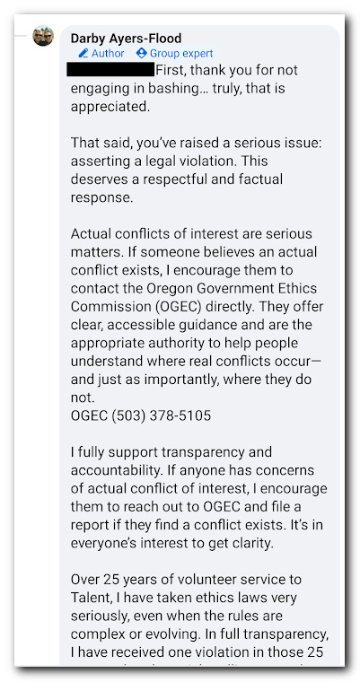 Her response is instructive. It reflects a mindset that runs through much of Talent City Council and shows up repeatedly in their comments and decisions. Ethical concerns like this are treated as relevant only if a single, discrete act can be proven to be a violation and subject to punishment by OGEC. If not, the complaint is dismissed a personal attack, partisan sabotage, bad faith, or ignorance.