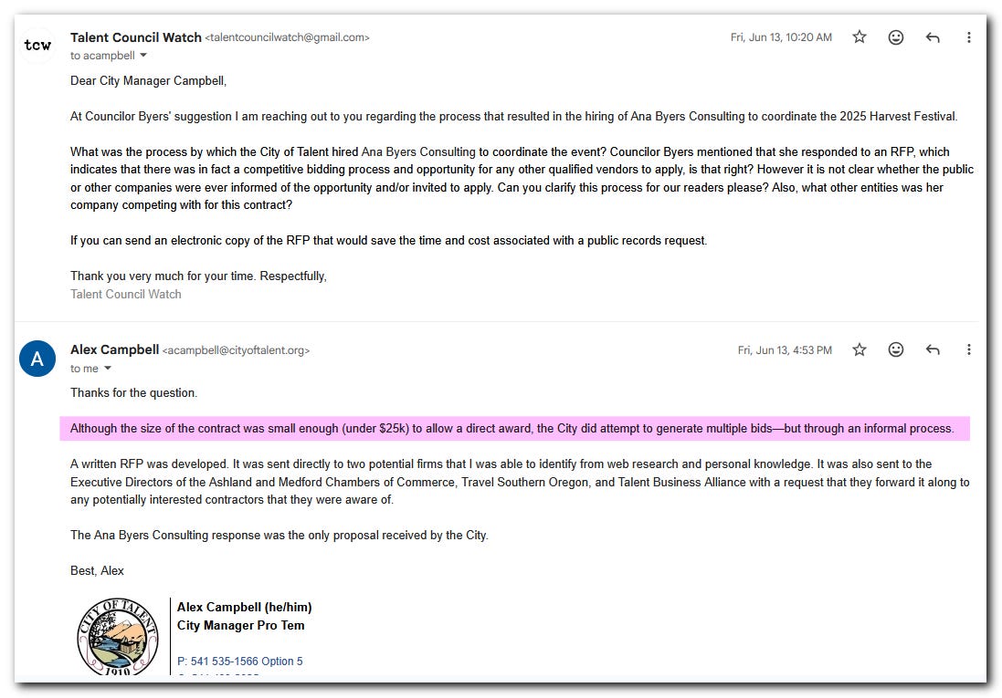 Other businesses and nonprofits stop bothering to participate. When one organization consistently has early access, inside knowledge, and City backing, other potential contributors or competitors reasonably conclude the process is not worth their time. That’s fewer ideas, fewer local voices, less competition, and missed opportunities for Talent businesses that don’t have political access. We’re already seeing this happen quite a bit.