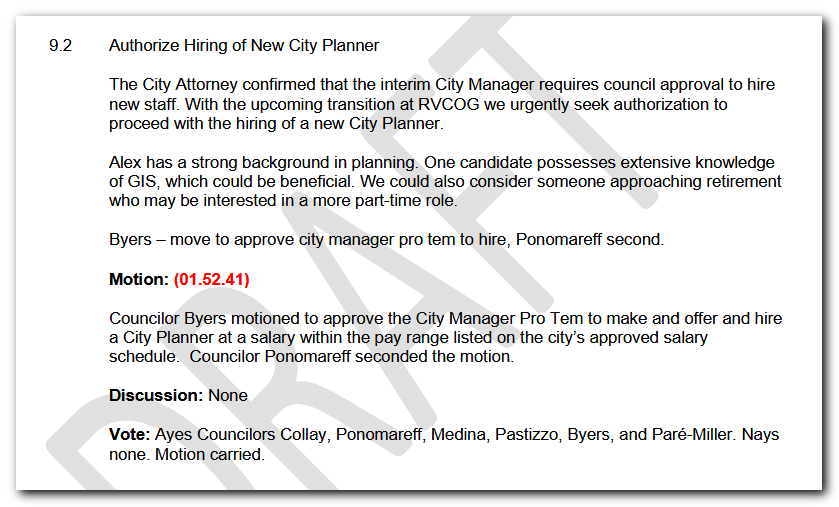 Six weeks prior to that announcement, Alex Campbell had received authorization from City Council to hire for the City Planner role, with one particularly strong mapping data candidate in mind. Importantly, Council did not authorize him to hire specifically that candidate nor Bagnoli,2 only to hire someone for the Planner position.