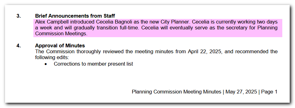 Alex Campbell introduced Cecelia Bagnoli as the new City Planner. Cecelia is currently working two days a week and will gradually transition to full-time. Cecelia will eventually serve as the secretary for Planning Commission Meetings.