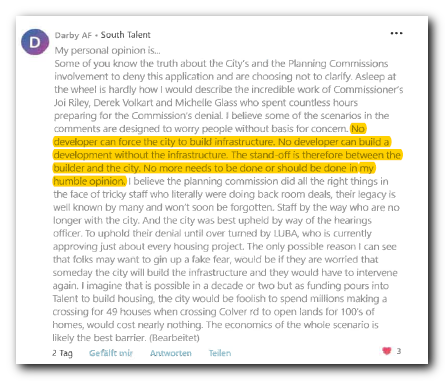 What’s likely to be argued by the plaintiff’s attorneys in court is that in the Belmont case, the elite weren’t the developers but rather the City’s own leaders, who are being accused of bending planning decisions to shield their own neighborhoods and those of their friends. The depositions and exhibits included in trial documents show the plaintiff’s attorney trying to make the case that the close personal relationships between the Mayor, the Chair of the Planning Commission, and the Founder of the South Talent Neighborhood Association played a role in determining the outcome, aka the failure, of Talent View Estates.